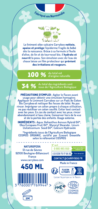 Formulé avec 3 huiles bio (olive, lin, tournesol), ce liniment contient 100% d’ingrédients d’origine naturelle et est certifié bio.